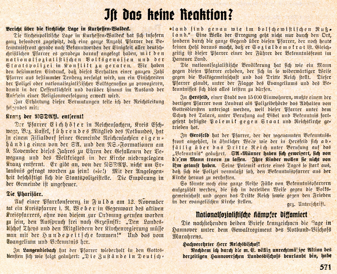 Of all things, the German Christians’ magazine “Evangelium im Dritten Reich” is a rewarding source for a wide variety of examples of individual Christians’ nonconformity under National Socialism.